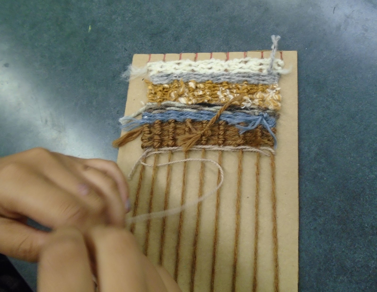 Third Grade artists are weaving. We are learning four different weaving techniques: tabby weave, Egyptian knot, tapestry shapes and tapestry slits. We will mount these on paper once we get them off of the cardboard looms!