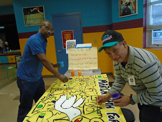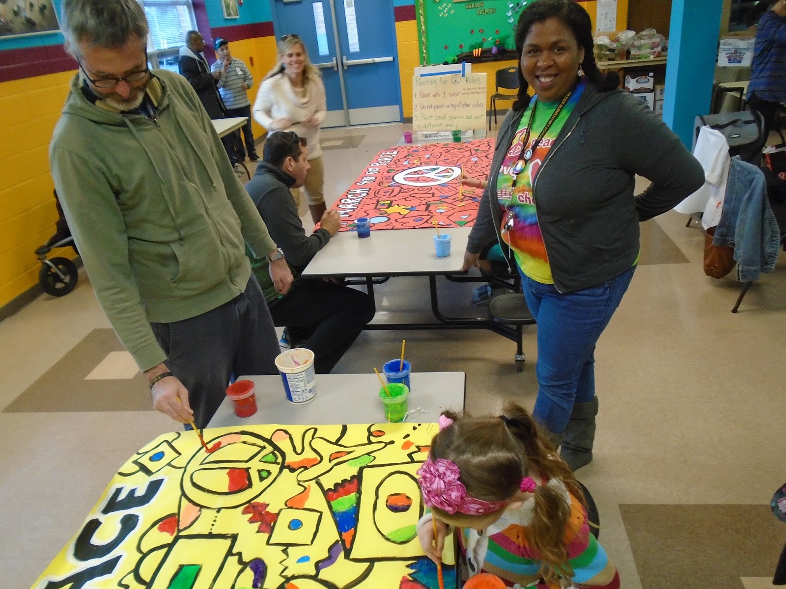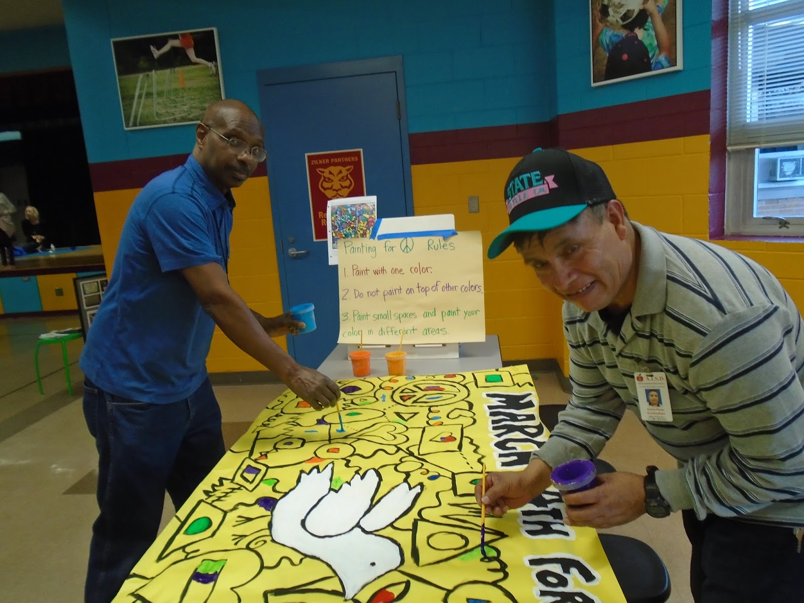 Art students and Zilker staff had a great time painting banners for our upcoming Peace March on March 4th.  This was part of our Family Night at Zilker on February 4th,  supporting healthy living and our annual Library Book Fair.